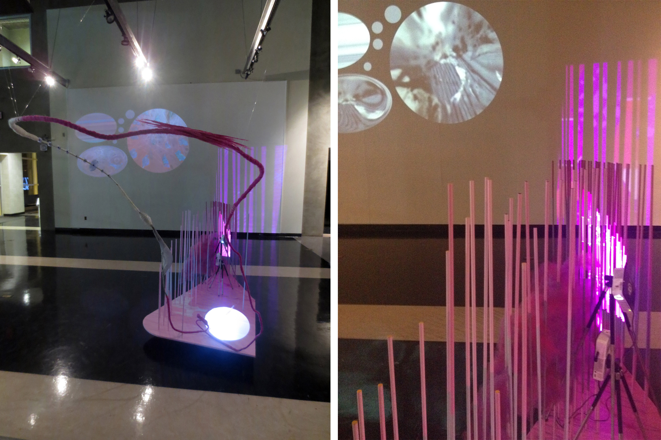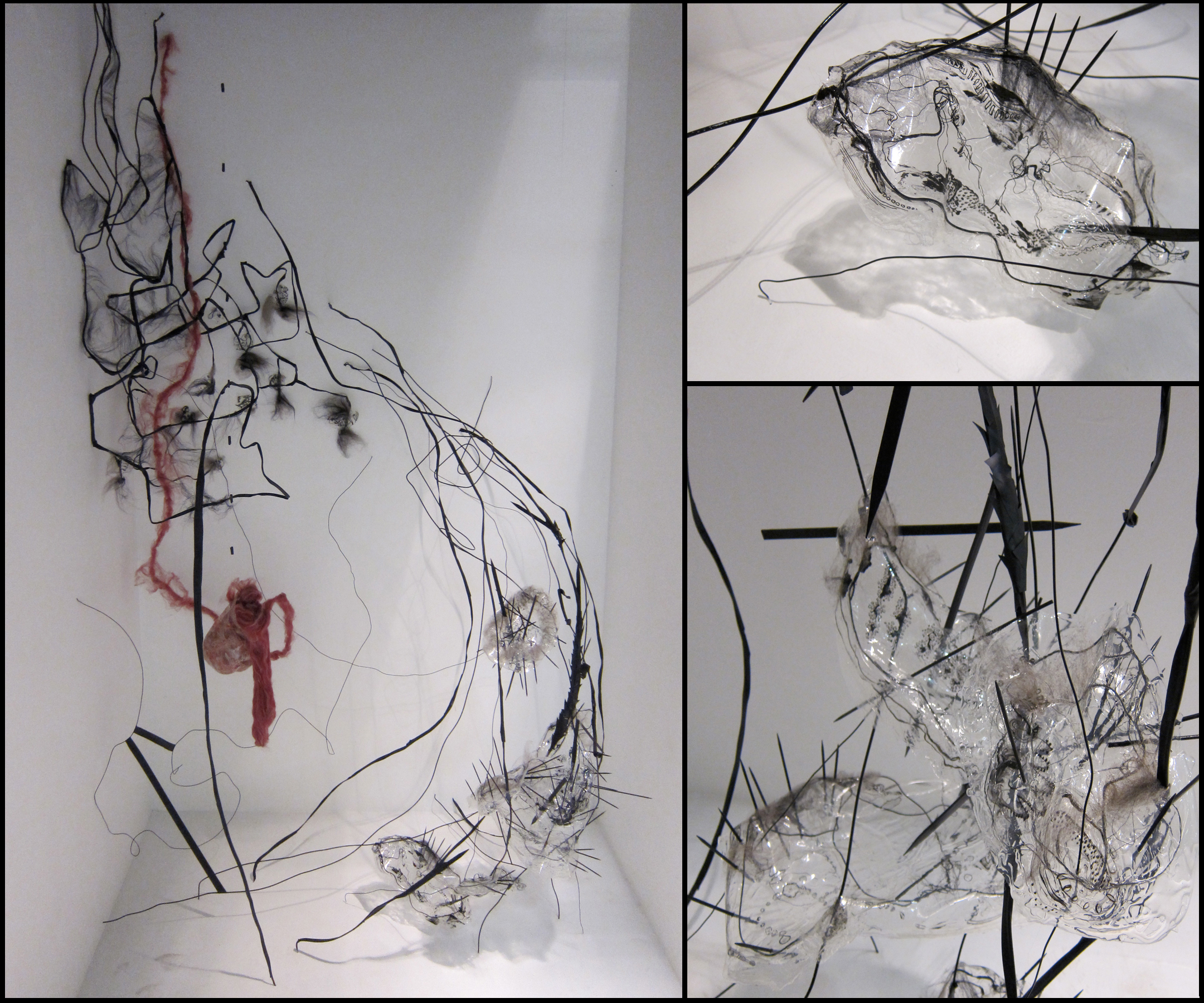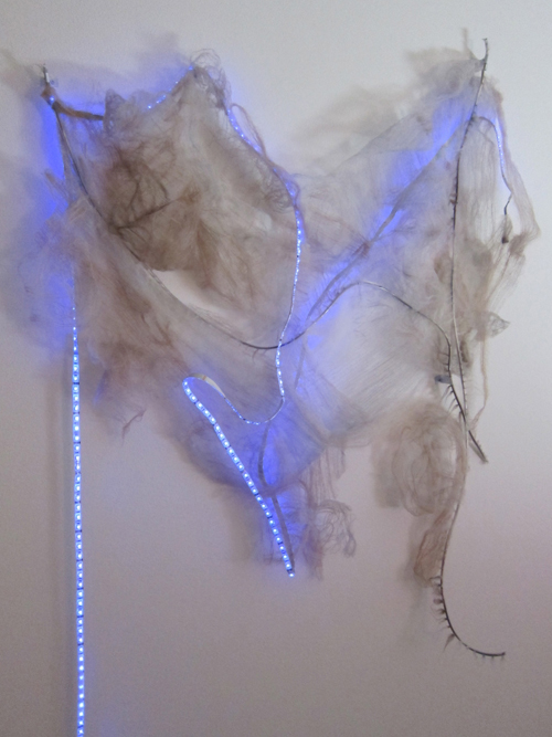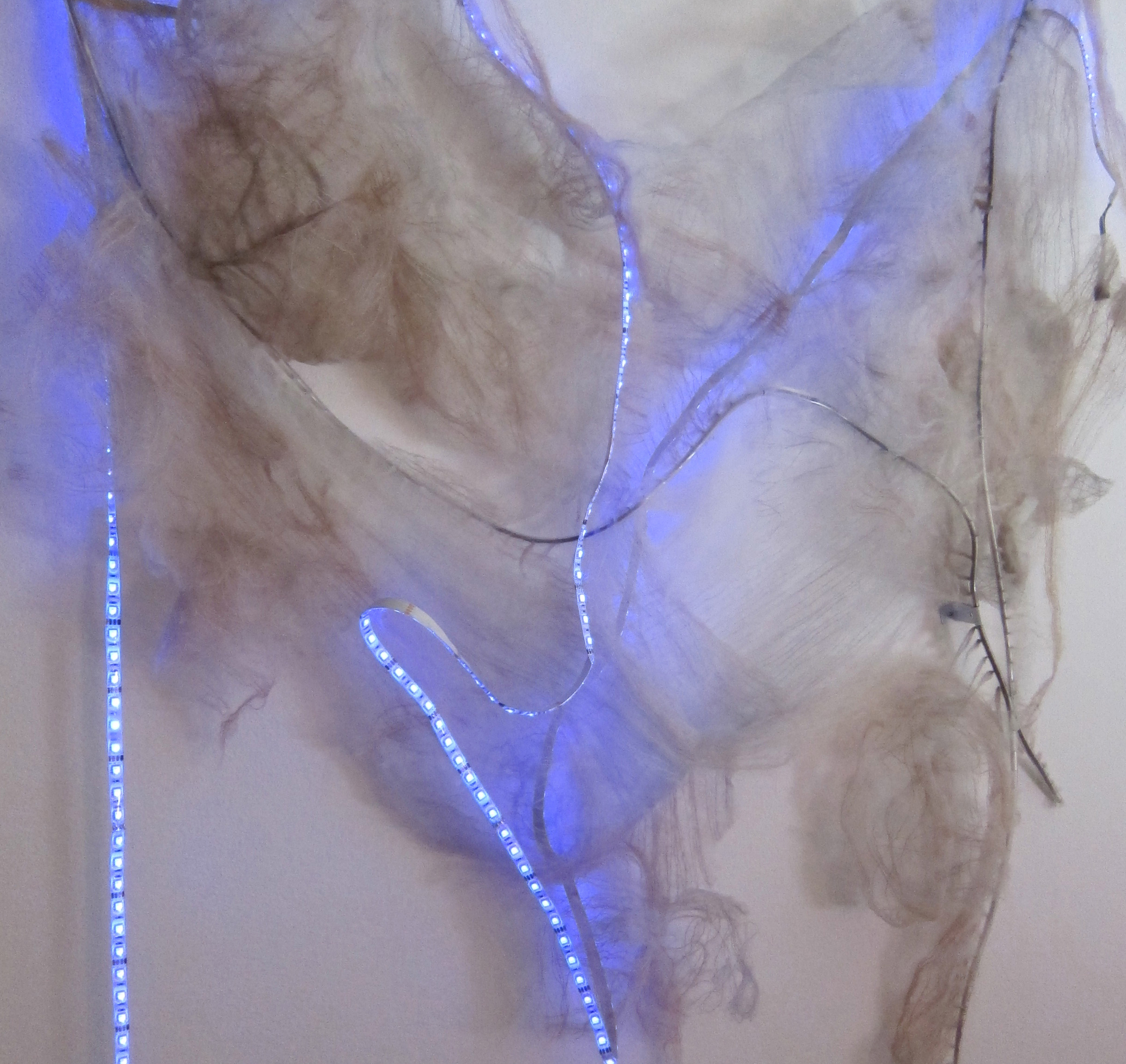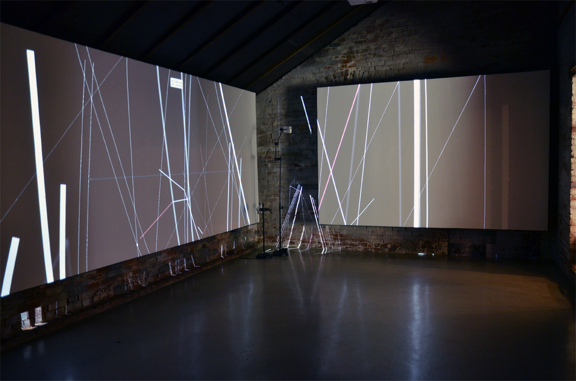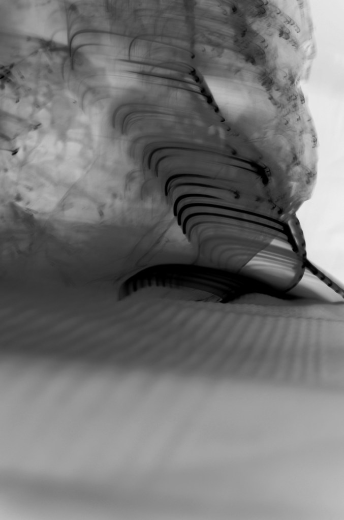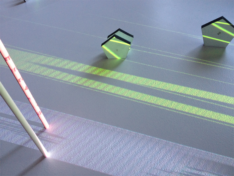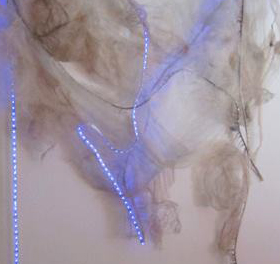 Can Art Stress? This acoustic, interactive installation is based on a defense mechanism: the reduction of noise in the face of danger. When exposed to the examining eye of the viewer who invades its personal space, the acoustic installation reacts as a frightened organism: it becomes quiet. Once the viewer returns back to a safe distance the humming of the structure is reactivated.
