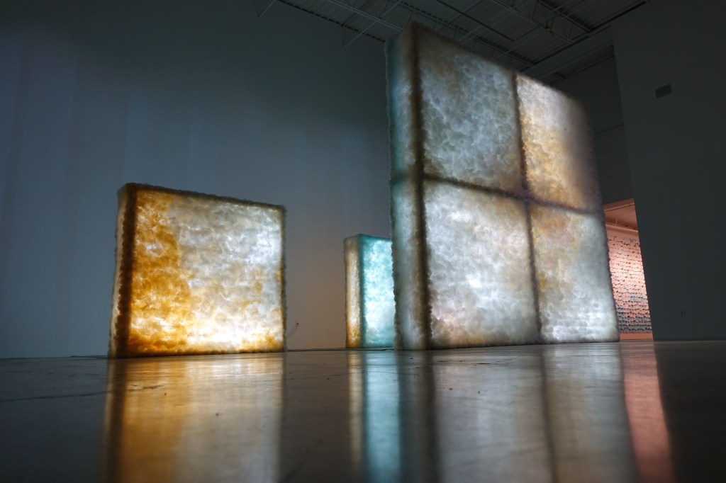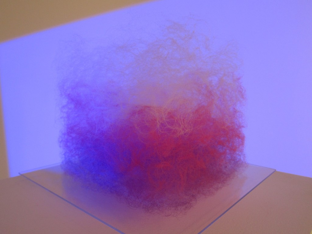 “Breaking with the rectilinear conventions of wall work, Digital Synesthesia 1 (2019) and 2 (2019), consist of asymmetrical arrangements of wool, mesh cylinders, and looping videos. The animation shows patterns of dots and complex webs of filaments. These shift and rotate; sometimes, they imbue fleeting illusory depth on the physical assemblage, blurring the lines between media just as synesthesia confuses sensory input. The abstract imagery calls to mind internal networks of nerves, which produce such multisensory experiences. Most compellingly, synesthesia suggests mutability, transformation, and the potential of the body to transcend constraints—concepts inherent to transhumanism.” Rebecca Brantley for The Brooklyn Rail