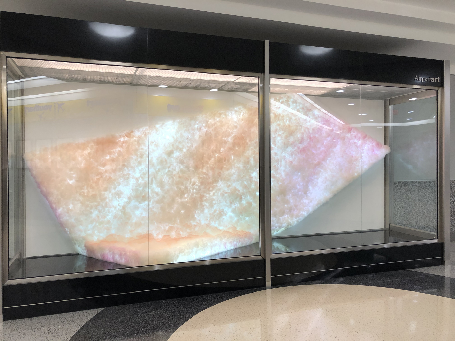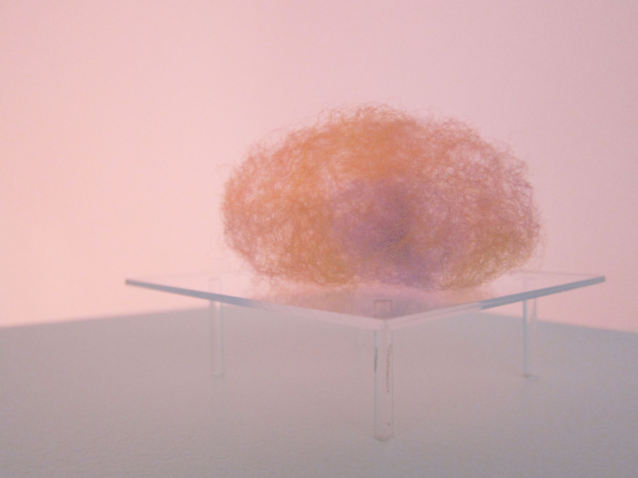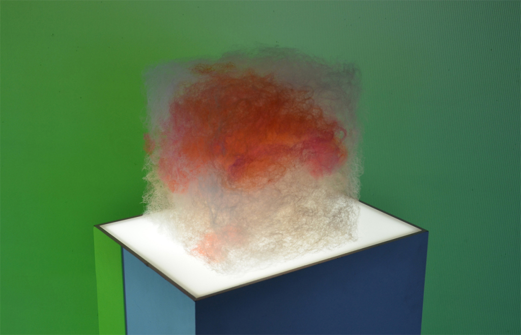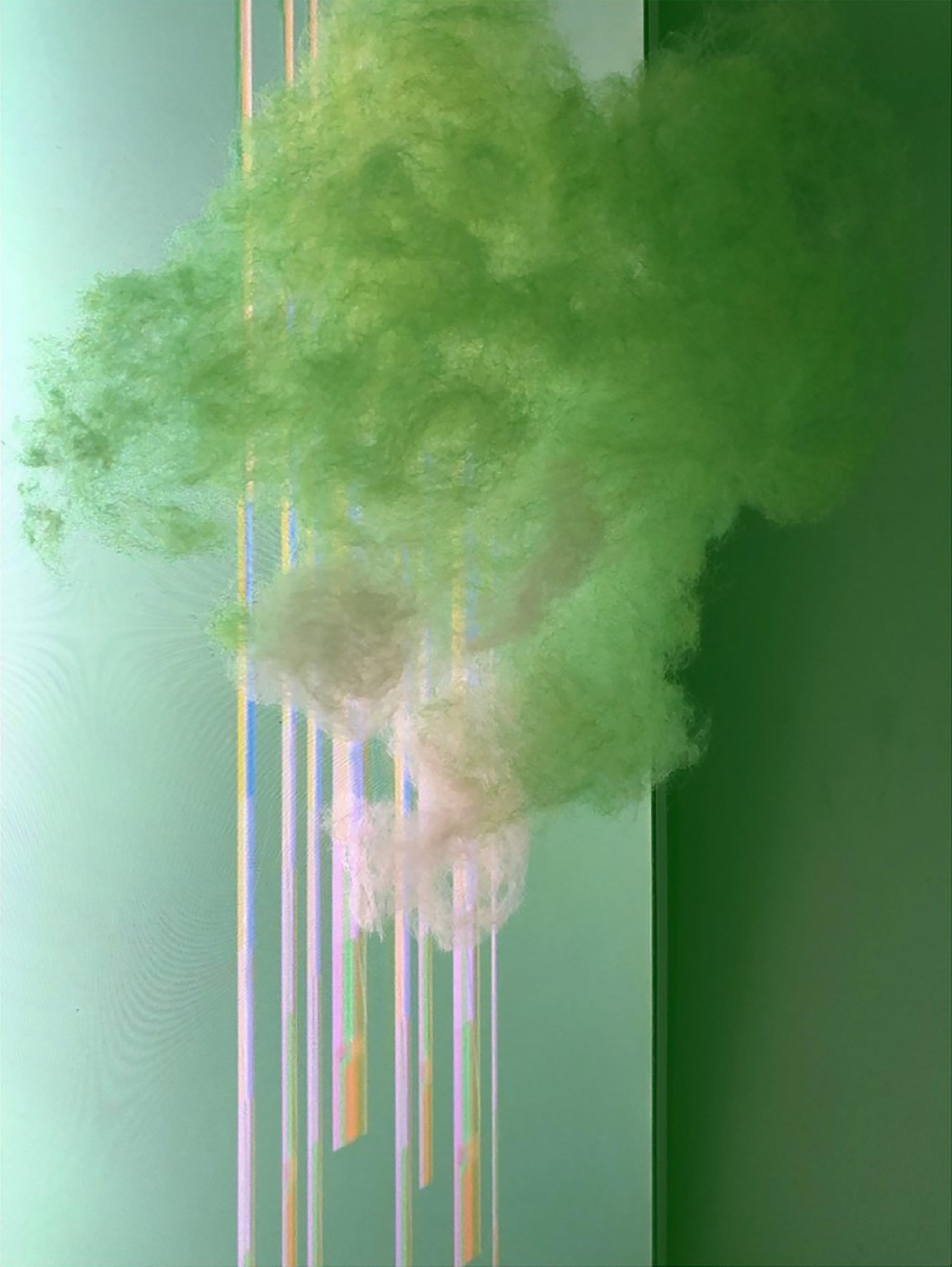 “Breaking with the rectilinear conventions of wall work, Digital Synesthesia 1 (2019) and 2 (2019), consist of asymmetrical arrangements of wool, mesh cylinders, and looping videos. The animation shows patterns of dots and complex webs of filaments. These shift and rotate; sometimes, they imbue fleeting illusory depth on the physical assemblage, blurring the lines between media just as synesthesia confuses sensory input. The abstract imagery calls to mind internal networks of nerves, which produce such multisensory experiences. Most compellingly, synesthesia suggests mutability, transformation, and the potential of the body to transcend constraints—concepts inherent to transhumanism.” Rebecca Brantley for The Brooklyn Rail