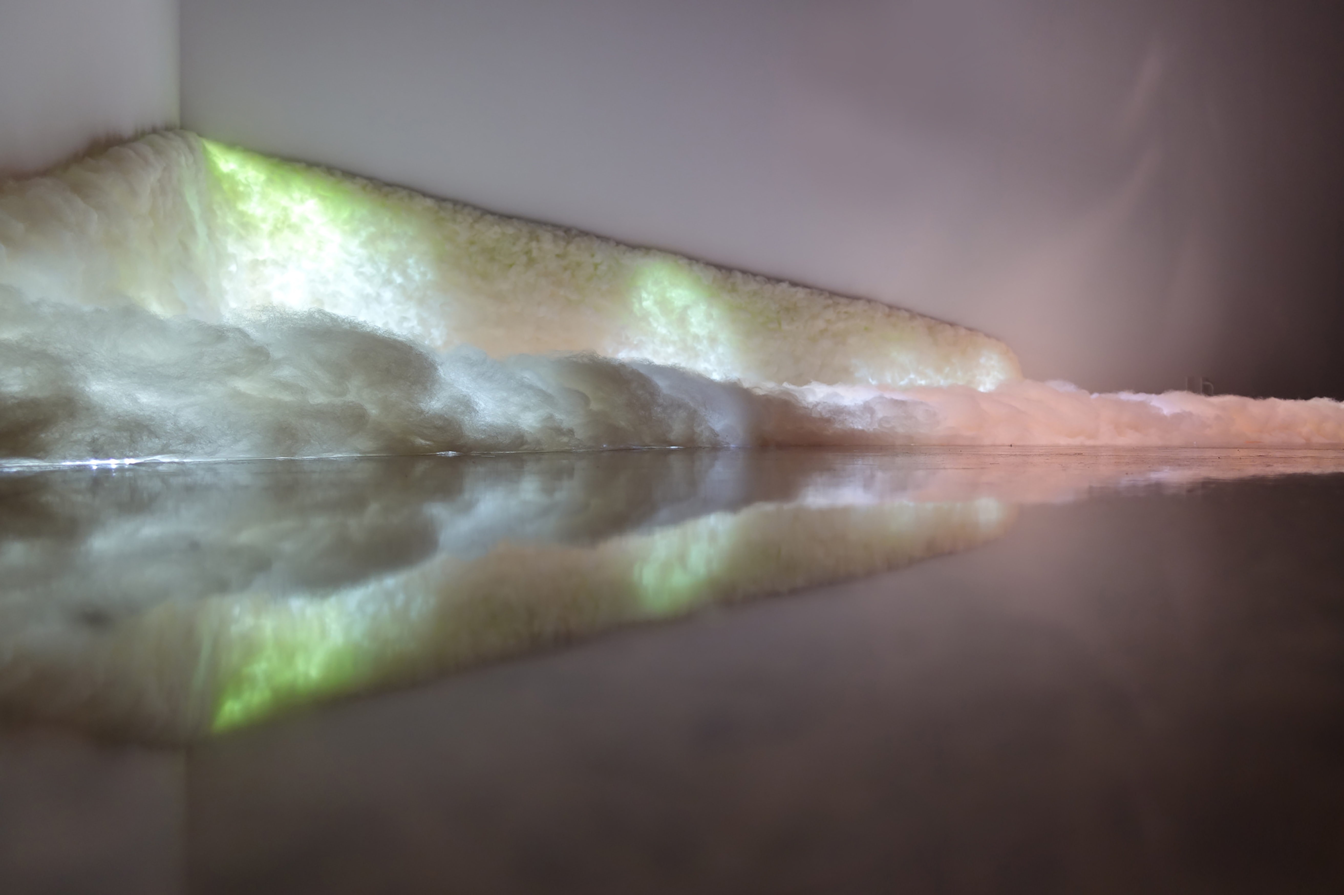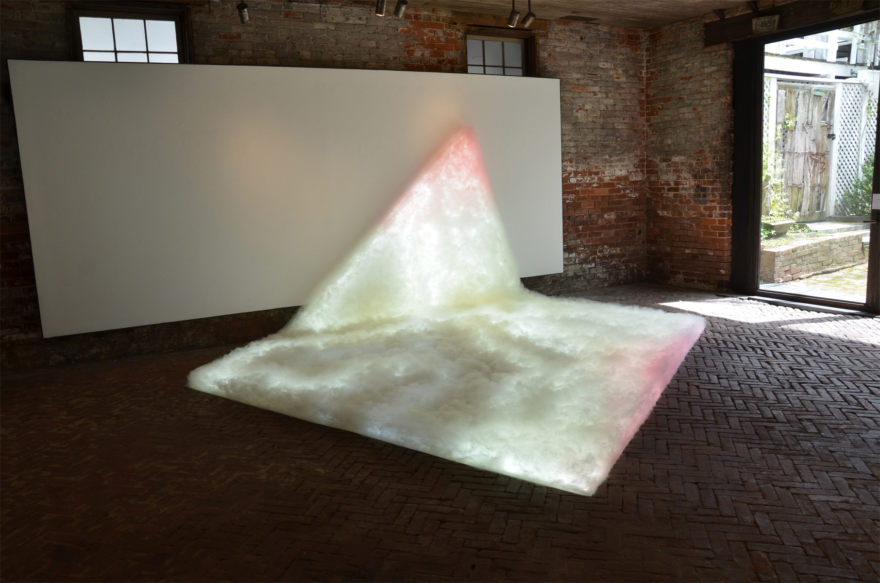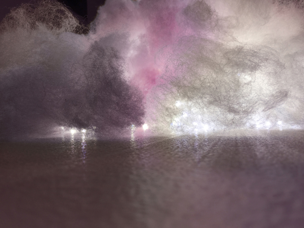 “Breaking with the rectilinear conventions of wall work, Digital Synesthesia 1 (2019) and 2 (2019), consist of asymmetrical arrangements of wool, mesh cylinders, and looping videos. The animation shows patterns of dots and complex webs of filaments. These shift and rotate; sometimes, they imbue fleeting illusory depth on the physical assemblage, blurring the lines between media just as synesthesia confuses sensory input. The abstract imagery calls to mind internal networks of nerves, which produce such multisensory experiences. Most compellingly, synesthesia suggests mutability, transformation, and the potential of the body to transcend constraints—concepts inherent to transhumanism.” Rebecca Brantley for The Brooklyn Rail