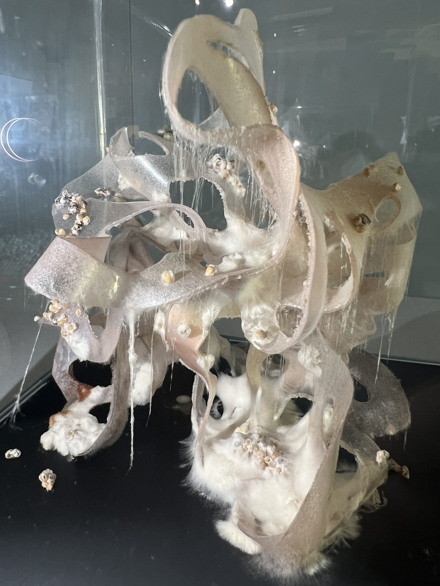 Polyester resin sculpture inoculated with Pleurotus ostreatus, a species of fungi capable of metabolizing synthetic polymers.